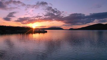 Stunning 4K aerial footage of a Washington State ferry arriving at the Anacortes terminal during a glowing Pacific Northwest sunset. The golden light reflects off the calm waters of the Salish Sea as the ferry glides gracefully toward the dock, framed by the San Juan Islands and distant coastal hills. This cinematic drone video captures the tranquil rhythm of evening travel across Puget Sound — perfect for lovers of maritime scenery, Northwest sunsets, and aerial cinematography.