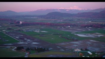 Cinematic 4K aerial footage of Mount Baker glowing at sunset above the farmlands of the Skagit Valley in Washington State. The golden light of evening spreads across rivers, fields, and foothills as the mountain rises majestically on the horizon. This breathtaking view captures the serene beauty and color of the Pacific Northwest landscape — a perfect piece for lovers of drone cinematography, mountain sunsets, and Northwest nature.