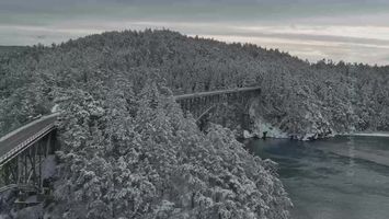 Stunning 4K aerial footage of the Deception Pass Bridge blanketed in snow, connecting Whidbey Island and Fidalgo Island in Washington State. The rare winter scene captures frosted trees, icy cliffs, and calm emerald waters beneath the bridge’s graceful steel arches. This cinematic drone video showcases the unique beauty of the Pacific Northwest coast in winter — a perfect blend of rugged landscape and tranquil atmosphere.