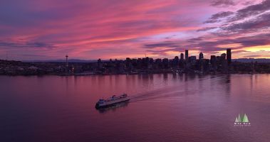 A stunning 5K aerial video capturing a Washington State Ferry departing Seattle for Bainbridge Island under the warm glow of sunrise. The soft morning light bathes the Seattle waterfront, Space Needle, and Elliott Bay in gold as the ferry glides peacefully across the calm waters of Puget Sound. This cinematic footage highlights the serenity and motion of Seattle’s iconic maritime commute — a perfect fusion of city skyline, coastal reflections, and Pacific Northwest tranquility. Filmed in high-resolution 5K quality, ideal for broadcast, editorial, commercial, or tourism licensing showcasing Seattle’s waterfront at dawn.