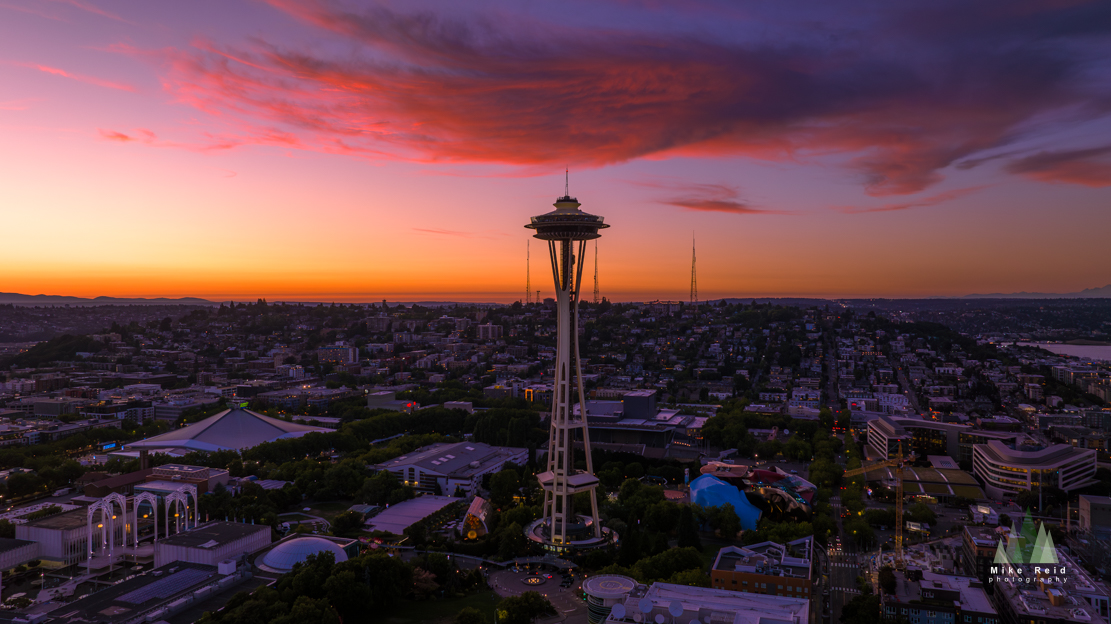 Aerial Seattle Sunset Space Needle Fiery Clouds