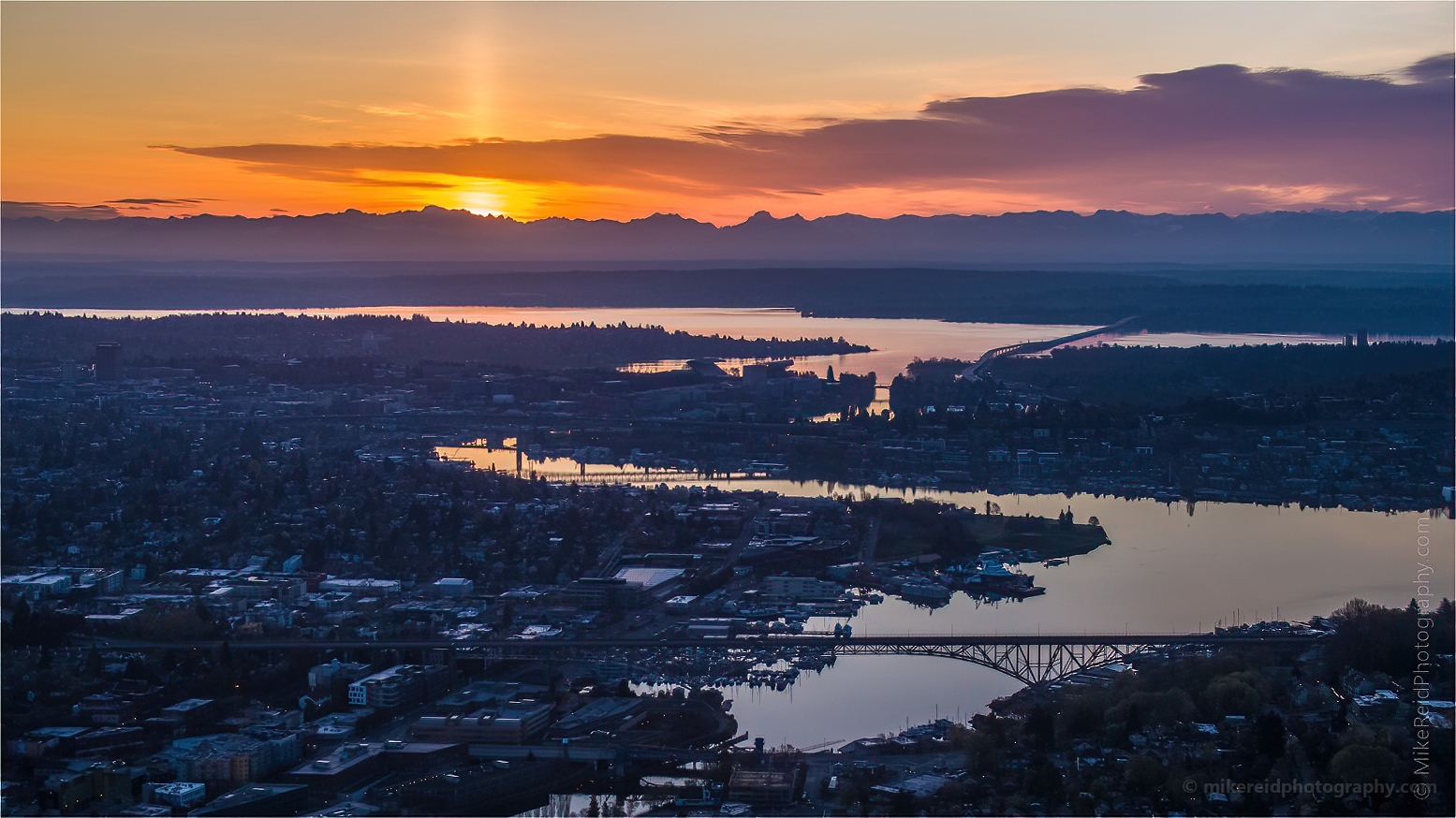 Aerial Lake Washington Ship Canal to the Eastside Sunrise Sun Pillar #seattle #dronephotography #dronevideo #aerial #aerialphotography #aerialvideo #northwest #washingtonstate