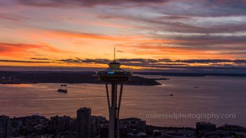 Aerial view of Seattle’s Space Needle at sunset with ferries crossing Elliott Bay and West Seattle beyond. The sky burns with orange and magenta streaks as the last light of day reflects over the Puget Sound, creating a classic Pacific Northwest evening cityscape.