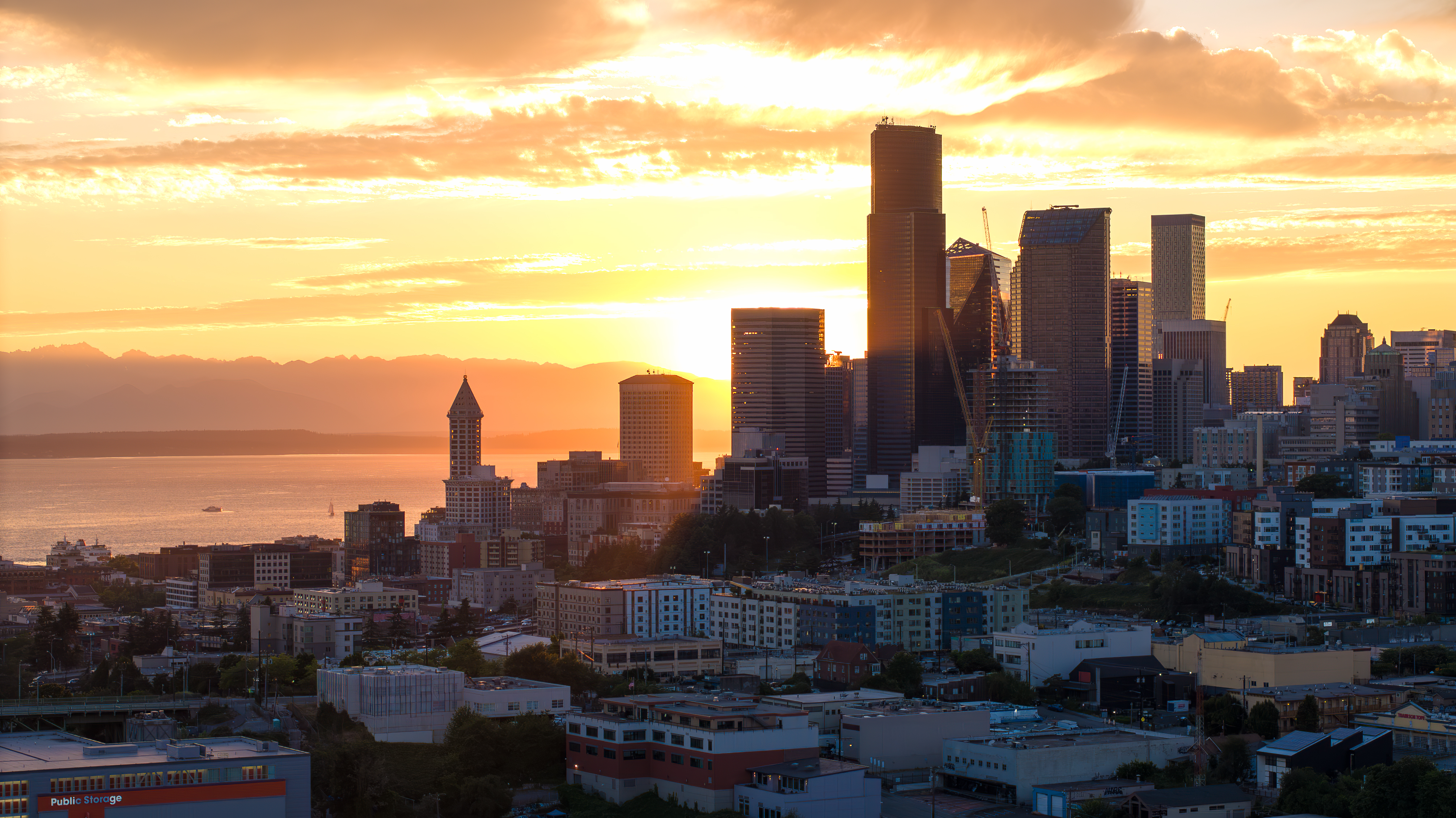 Golden sunset light streams through the skyscrapers of downtown Seattle in this striking aerial cityscape. Smith Tower stands proudly in the foreground as the Olympic Mountains and Elliott Bay glow beneath the radiant Pacific Northwest evening sky.