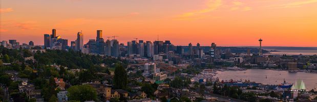 Sunset over Seattle from above Capitol Hill, capturing the city’s skyline glowing in warm orange and pink tones. The Space Needle rises above Lake Union and downtown, while the neighborhoods below blend urban vibrance with lush greenery—an iconic Pacific Northwest moment of calm and color.