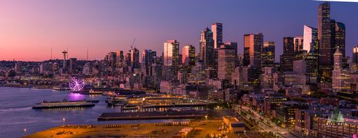 Seattle’s skyline radiates in a warm magenta twilight, reflecting the last light of sunset over Elliott Bay. The Space Needle and Great Wheel glow vividly along the waterfront, while the city’s modern high-rises shimmer with hues of pink and gold. This aerial perspective captures the vibrant pulse of downtown Seattle as day fades into night — a perfect blend of urban architecture, water, and Pacific Northwest color.