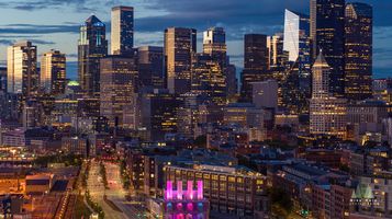 Seattle’s downtown skyline comes alive at blue hour, with city lights glowing warmly against deep twilight skies. The Smith Tower, Columbia Center, and F5 Tower shine among modern skyscrapers, their reflections casting golden hues through the heart of the city. Viewed from above Pioneer Square, the illuminated streets and glowing architecture capture the timeless beauty and energy of Seattle’s urban core.
