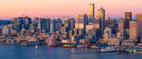 Aerial Seattle Sunset Skyline Seattle’s skyline radiates in the golden hues of sunset, its glass towers bathed in warm light as the day fades over Elliott Bay. The Seattle Great Wheel glows along the waterfront, and a sailboat drifts across the sunlit water beneath a rose-colored sky. This aerial view captures the city’s transition into evening — a stunning blend of architecture, color, and Pacific Northwest serenity.