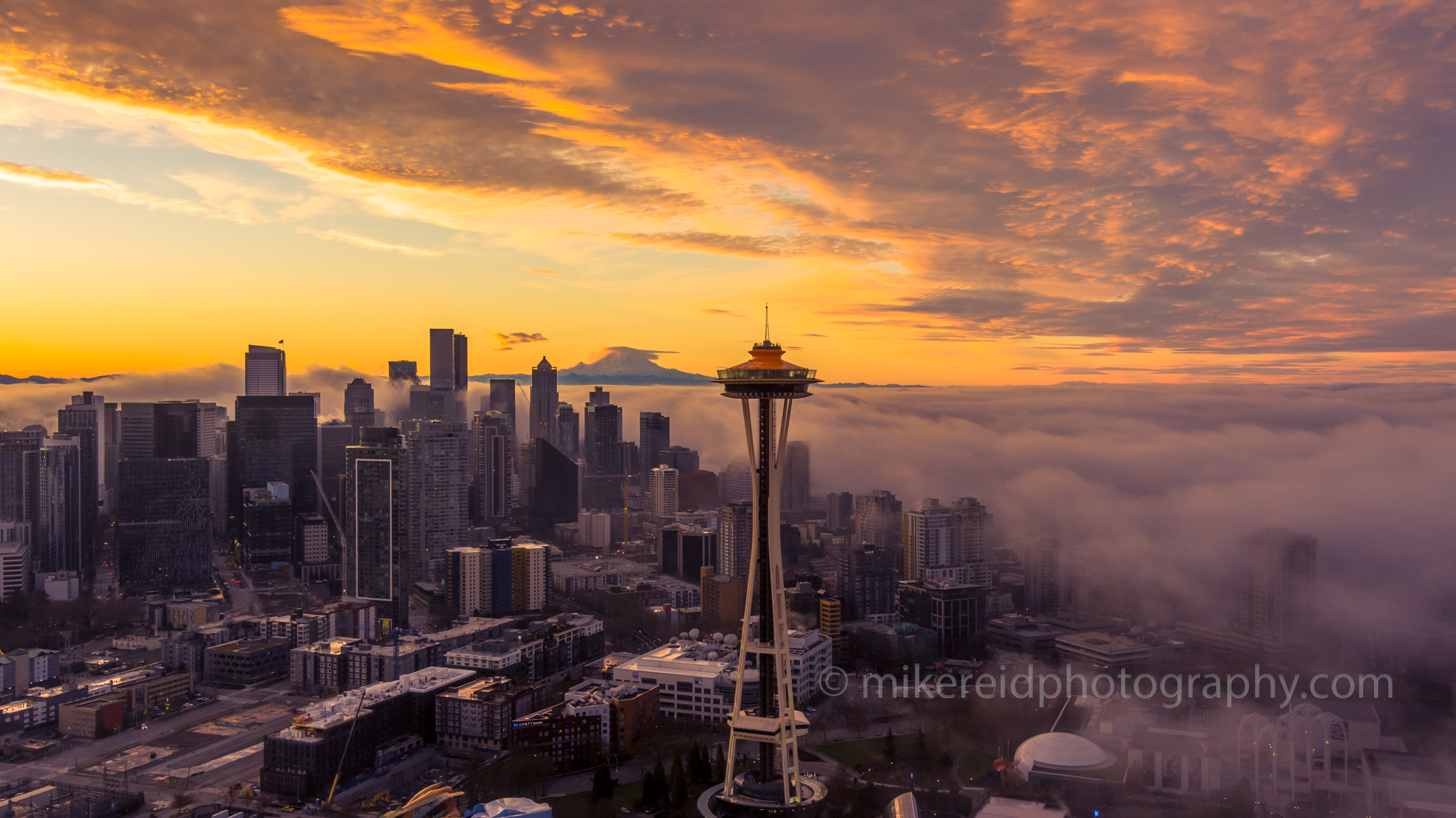 Aerial sunrise view of Seattle’s downtown skyline bathed in warm morning light, with soft clouds and Mount Rainier glowing in the distance.