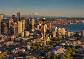 Golden evening light bathes the Seattle skyline in warmth as the iconic Space Needle rises prominently above the city. In the distance, Mount Rainier glows softly beneath the clear sky, creating a stunning contrast between the urban skyline and the mountain’s timeless grandeur. The play of light and shadow highlights the beauty of Seattle’s architecture and its connection to the surrounding natural splendor.