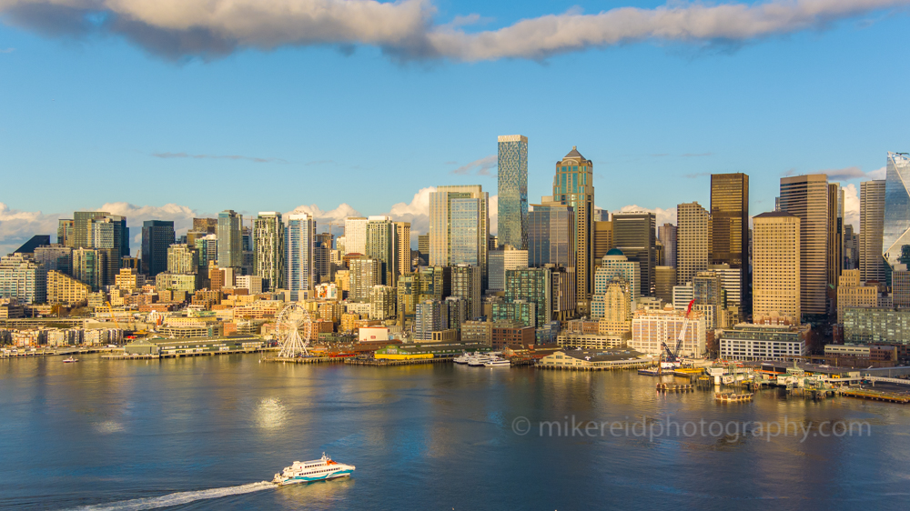 A brilliant aerial capture of the Seattle skyline bathed in late afternoon light as a water ferry glides across Elliott Bay toward the bustling waterfront. The city’s iconic architecture — including the Great Wheel, Smith Tower, and shimmering modern towers — reflects in the calm blue water under a canopy of soft clouds. This dynamic image perfectly embodies Seattle’s connection between city and sea, showcasing both movement and tranquility in one vibrant Pacific Northwest scene.