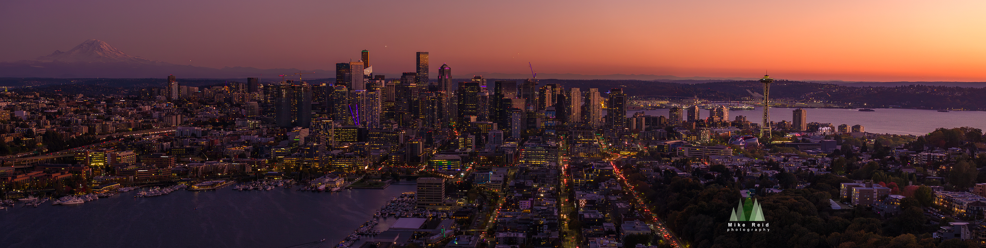 A sweeping aerial panorama of Seattle at sunset, looking down Fairview Avenue and Aurora Avenue as the city glows in soft orange and purple light. The Space Needle stands tall above the city’s vibrant core, while Mount Rainier rises majestically in the distance under a glowing sky. Reflections shimmer across Lake Union and Elliott Bay, blending the warmth of the setting sun with the cool tones of twilight for a breathtaking Pacific Northwest cityscape.