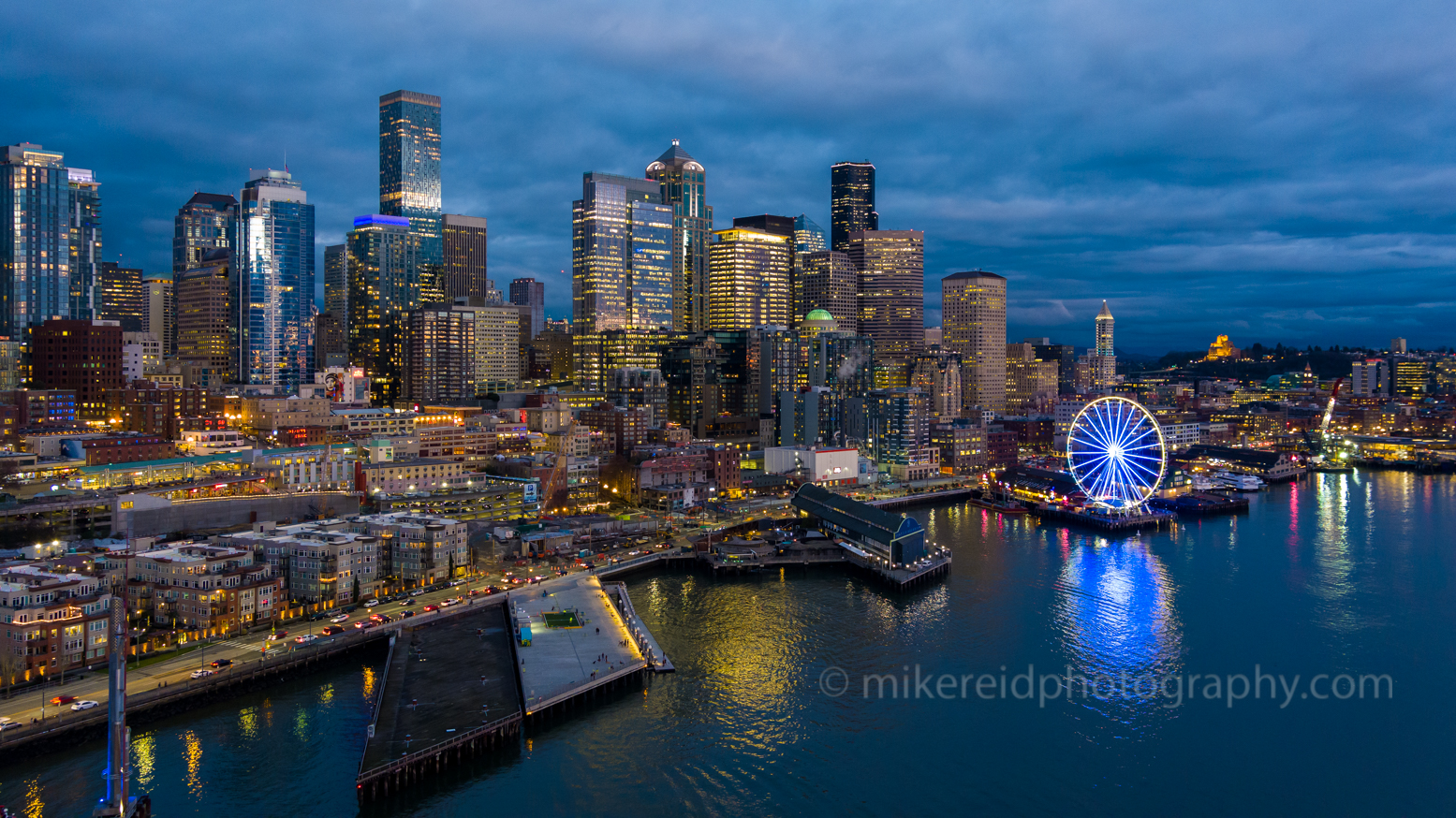 A stunning aerial view of downtown Seattle during the blue hour, where city lights shimmer across the waterfront and the Seattle Great Wheel glows brilliantly against the deepening sky. The illuminated skyscrapers reflect beautifully on Elliott Bay, highlighting the city’s vibrant urban energy and maritime charm. This captivating scene captures the essence of Seattle’s waterfront as daylight fades into night — a perfect blend of modern architecture and Pacific Northwest atmosphere.