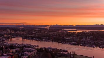 A brilliant orange and magenta sunrise unfolds over Seattle’s I-5 Freeway Bridge, casting a warm glow across Lake Union and the city below. The still morning water mirrors the color-soaked sky, while distant Olympic Mountains frame the horizon in soft silhouette. Steam rises gently into the dawn, adding a touch of atmosphere to this tranquil urban moment — a breathtaking balance of motion, color, and calm in the heart of Seattle.