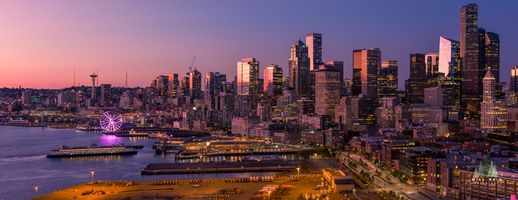The Seattle skyline glows beneath a radiant purple and rose-colored sunset, where the last light of day glints off the downtown towers. The Seattle Great Wheel lights up along the waterfront, while ferries glide across Elliott Bay under a calm evening sky. From the Space Needle to the Columbia Center, this panoramic view captures Seattle’s skyline in one of its most vibrant and peaceful moments of twilight.