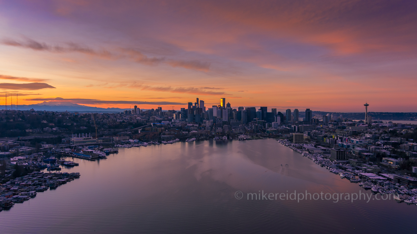 Soft morning light illuminates the Seattle skyline as dawn breaks over Lake Union, with the distant peak of Mount Rainier glowing beneath painted clouds. The Space Needle stands tall in the quiet calm of sunrise, mirrored by gentle ripples on the water below. This aerial panorama captures the peaceful beauty and iconic contrasts that define Seattle — where mountains meet the city and day begins over the Pacific Northwest.