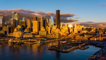 A glowing aerial portrait of Seattle’s downtown skyline basking in the golden light of sunset. The city’s iconic high-rises — including the Columbia Center and F5 Tower — shimmer under warm evening tones as low clouds roll across the horizon. Reflections dance along the waterfront piers and Elliott Bay, capturing the balance between light and shadow that defines the Pacific Northwest. This stunning composition celebrates the magic hour when Seattle glows in radiant gold beneath a dramatic sky.