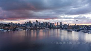 A dramatic sunset unfolds over Lake Union as storm clouds roll above the Seattle skyline. The dark clouds glow faintly with warm evening light, creating a vivid contrast between shadow and reflection on the calm water below. The Space Needle stands on the right, watching over the city as soft hues of pink and purple paint the sky — a moody and unforgettable Pacific Northwest evening where nature and architecture meet in perfect balance.