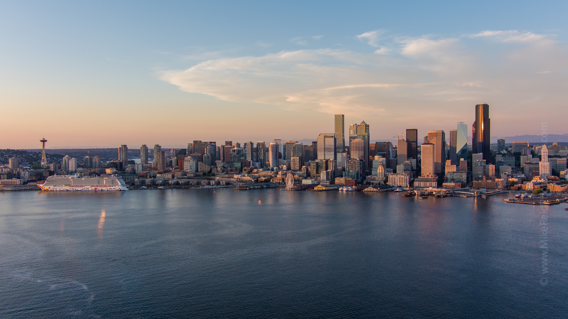 A warm sunset illuminates the Seattle skyline as a cruise ship rests along the waterfront, ready for departure. The Space Needle and Great Wheel stand proudly against a pastel sky, while the city’s glass towers glow with the last golden light of the day. The tranquil waters of Elliott Bay mirror the fading colors of dusk, creating a serene balance between travel, architecture, and the natural beauty of the Pacific Northwest.