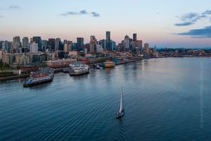 A peaceful Seattle evening unfolds as a lone sailboat glides gracefully across Elliott Bay, leaving soft ripples in its wake. The downtown skyline glows faintly in the fading light, with the Great Wheel, piers, and high-rises reflecting the calm beauty of dusk. This tranquil aerial scene captures the perfect balance of urban life and maritime serenity — a quintessential Pacific Northwest moment.