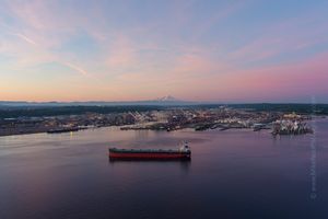 An aerial view of the Port of Seattle at dawn, where a cargo ship rests quietly in Elliott Bay beneath a sky painted in soft pink and lavender hues. In the distance, snow-capped Mount Rainier rises majestically above the morning haze, glowing with the first light of sunrise. This serene moment captures the striking balance between Seattle’s industrial waterfront and the natural grandeur of the Pacific Northwest.