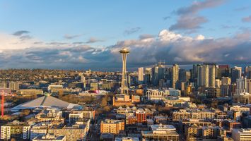 A high aerial view over the Space Needle and downtown Seattle’s skyline glowing beneath soft sunset hues.