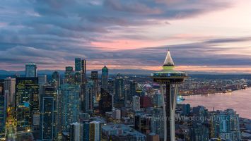 Aerial twilight view of Seattle’s Space Needle surrounded by the deep blue tones of dusk, with city lights reflecting off Puget Sound.
