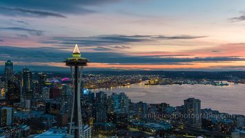Aerial twilight view of Seattle’s Space Needle with holiday lights surrounded by the deep blue tones of dusk, with city lights reflecting off Puget Sound.