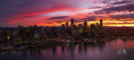An unforgettable Seattle sunrise ignites the sky in deep crimson and gold, casting reflections across the calm waters of Elliott Bay. Downtown’s glass towers glow with the first light of day, while the city slowly awakens beneath the vivid colors of dawn. This aerial view captures the perfect harmony of nature and architecture — a serene yet powerful moment where Seattle’s skyline meets the fiery beauty of morning.