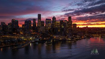 Over Seattle Sunrise Skyline Colors An unforgettable Seattle sunrise ignites the sky in deep crimson and gold, casting reflections across the calm waters of Elliott Bay. Downtown’s glass towers glow with the first light of day, while the city slowly awakens beneath the vivid colors of dawn. This aerial view captures the perfect harmony of nature and architecture — a serene yet powerful moment where Seattle’s skyline meets the fiery beauty of morning.