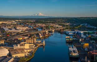 Over the Duwamish and First Avenue Bridge Aerial Drone Evening Light #seattle #dronephotography #dronevideo #aerial #aerialphotography #aerialvideo #northwest #washingtonstate