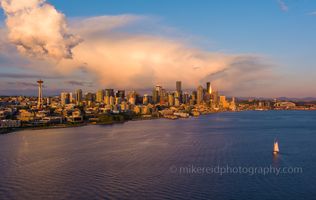 A dramatic evening unfolds over Seattle as golden light from the setting sun illuminates a towering storm cloud above the city. The Space Needle and shimmering downtown skyline stand against the fiery sky, while a lone sailboat drifts across the calm waters of Elliott Bay. This stunning dusk scene captures the balance between tranquility and power — where the Pacific Northwest’s natural drama meets the elegance of the urban skyline.
