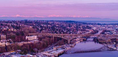 Seattle Aerial Photography Aurora Bridge Olympic Mountains Sunrise. #seattle #dronephotography #dronevideo #aerial #aerialphotography #aerialvideo #northwest #washingtonstate