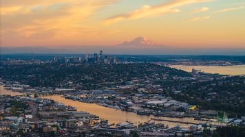 A breathtaking aerial view stretches across Seattle’s Ballard and Queen Anne Hill neighborhoods toward the downtown skyline, crowned by the majestic Mount Rainier glowing in soft sunset light. The golden waters of the Ship Canal reflect the warm evening hues as the mountain rises in the distance, creating a perfect balance between city, nature, and light. This image beautifully captures the layered essence of Seattle—its neighborhoods, harbor, and iconic volcanic peak all in one frame.
