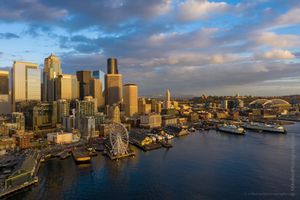 Seattle Aerial Photography City at Dusk Ferries Seattle’s waterfront glows in rich golden hour light as the sun breaks through soft clouds, illuminating the skyline and shimmering across Elliott Bay. The Seattle Great Wheel and ferry terminals add motion and life to the serene harbor scene, while the city’s iconic architecture—bathed in warm tones—contrasts beautifully with the blue reflections of the bay.