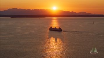 The Edmonds–Kingston ferry glides across the glowing waters of Puget Sound beneath a brilliant orange sunset. The Olympic Mountains rise in the distance, silhouetted by the fading light as golden reflections dance across the sea. This tranquil scene captures the timeless rhythm of Washington’s ferry crossings—serene, scenic, and quintessentially Pacific Northwest.