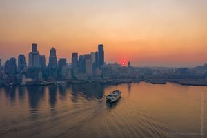 A hauntingly beautiful sunrise breaks through a veil of wildfire smoke above the Seattle skyline. The rising sun casts a fiery red glow over Elliott Bay, where a ferry glides toward the city, its wake tracing shimmering reflections on the calm water. The muted skyline, softened by haze, contrasts dramatically with the sun’s warmth—capturing both the serenity and surreal atmosphere of a smoky Pacific Northwest morning.
