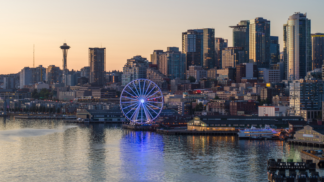 Aerial evening view of Seattle’s waterfront featuring the illuminated Great Wheel, the Space Needle, and downtown’s glassy skyline glowing in the warm light of dusk. The reflections over Elliott Bay capture the city’s vibrant Pacific Northwest charm.