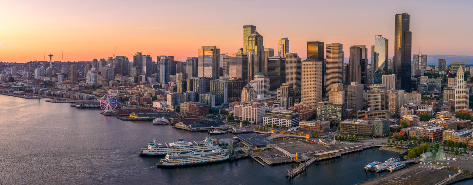 Aerial sunset panorama of downtown Seattle featuring the Space Needle, Great Wheel, and ferries docked along the waterfront. Warm evening light reflects off the skyline’s glass towers, capturing the city’s energy and beauty along Elliott Bay.