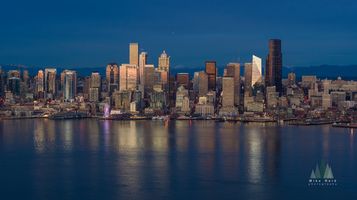 Aerial twilight view of downtown Seattle glowing under deep blue evening skies. The waterfront lights shimmer across Elliott Bay as the Great Wheel and skyline towers reflect the final golden light of day over the Pacific Northwest city. DJI X7 camera and 50mm lens.