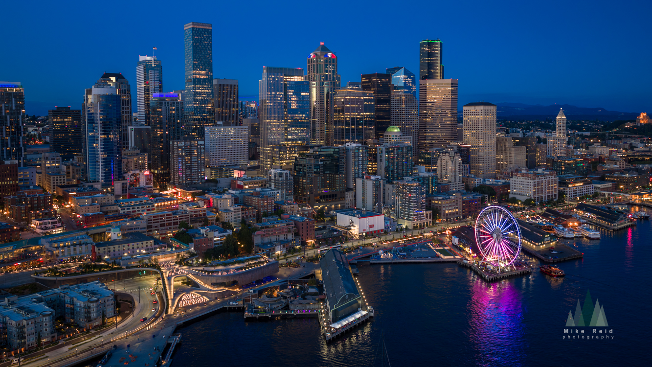 Aerial night view of downtown Seattle illuminated under a deep blue sky, with the Seattle Great Wheel glowing in vibrant colors along the waterfront. The reflections over Elliott Bay and the city’s lively lights showcase the energy and beauty of the Pacific Northwest at twilight. DJI Mavic 4 Pro drone.