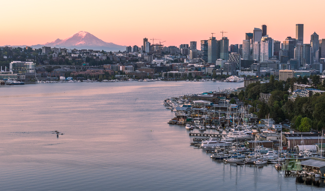 Soft morning light bathes Lake Union and downtown Seattle as rowers glide across the calm water in this tranquil aerial scene. The skyline rises beyond the marinas, with Mount Rainier glowing pink in the distance under a pastel sky. The composition captures the essence of Seattle’s waterfront life — a balance of nature, activity, and iconic beauty.
