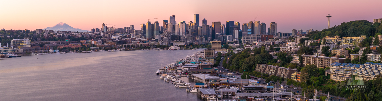 oft morning light bathes Lake Union and downtown Seattle as rowers glide across the calm water in this tranquil aerial scene. The skyline rises beyond the marinas, with Mount Rainier glowing pink in the distance under a pastel sky. The composition captures the essence of Seattle’s waterfront life — a balance of nature, activity, and iconic beauty.