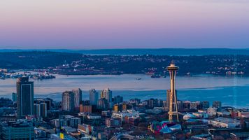 Aerial sunrise view of Seattle’s skyline reflected in the calm waters of Elliott Bay, with the Space Needle standing tall against the morning sky.
