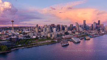 Seattle Storm Clouds Aerial Photography A dramatic evening unfolds over Seattle as golden light from the setting sun illuminates a towering storm cloud above the city. The Space Needle and shimmering downtown skyline stand against the fiery sky, while a lone sailboat drifts across the calm waters of Elliott Bay. This stunning dusk scene captures the balance between tranquility and power — where the Pacific Northwest’s natural drama meets the elegance of the urban skyline.