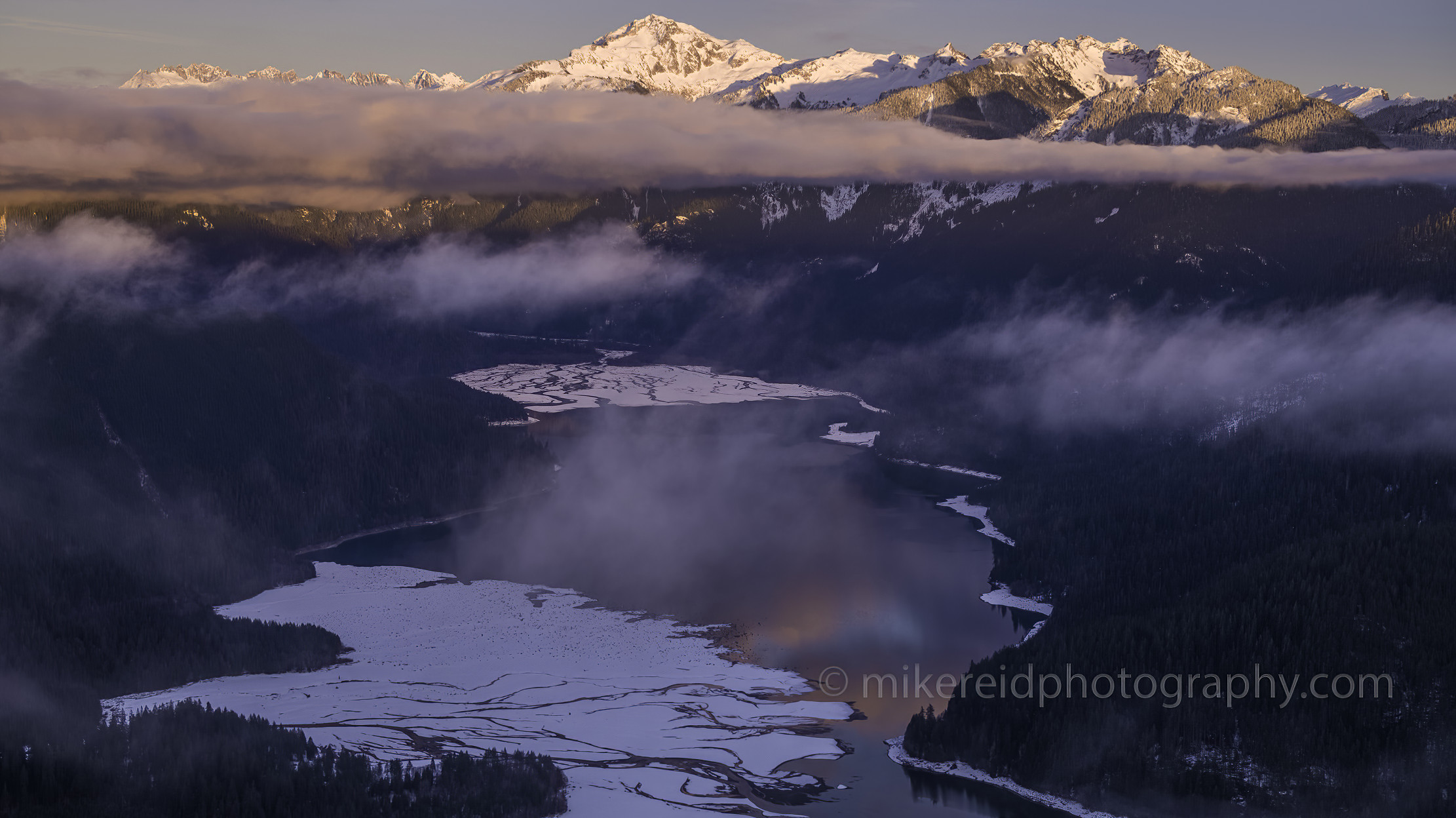 Soft morning light illuminates Baker Lake and the snow-covered peaks of the North Cascades in this breathtaking aerial view. Layers of mist drift above the still water as alpenglow paints the surrounding mountains in hues of rose and gold. Captured at sunrise, this fine art aerial photograph reveals the serene, untouched beauty of the Pacific Northwest wilderness. Perfect for wall art, collectors, or commercial licensing. Captured by Mike Reid Photography.