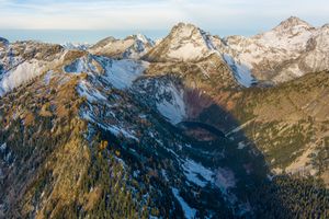 A fresh dusting of snow highlights the ridges and larch-studded slopes of Heather–Maple Pass in Washington’s North Cascades. Captured from above, this aerial photograph by Mike Reid Photography showcases the serene transition between fall and winter — golden larches glowing against the cool tones of early snow and alpine peaks. A breathtaking view of the Pacific Northwest’s high country at its most poetic and fleeting.
