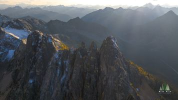 Sunlight breaks through alpine clouds to illuminate the iconic Liberty Bell peaks and golden larches surrounding Washington Pass in this dramatic aerial photograph by Mike Reid Photography. The interplay of shadow and glow highlights the rugged granite spires and the fleeting colors of autumn in the North Cascades. A breathtaking fine art aerial landscape that captures the grandeur and serenity of the Pacific Northwest wilderness.