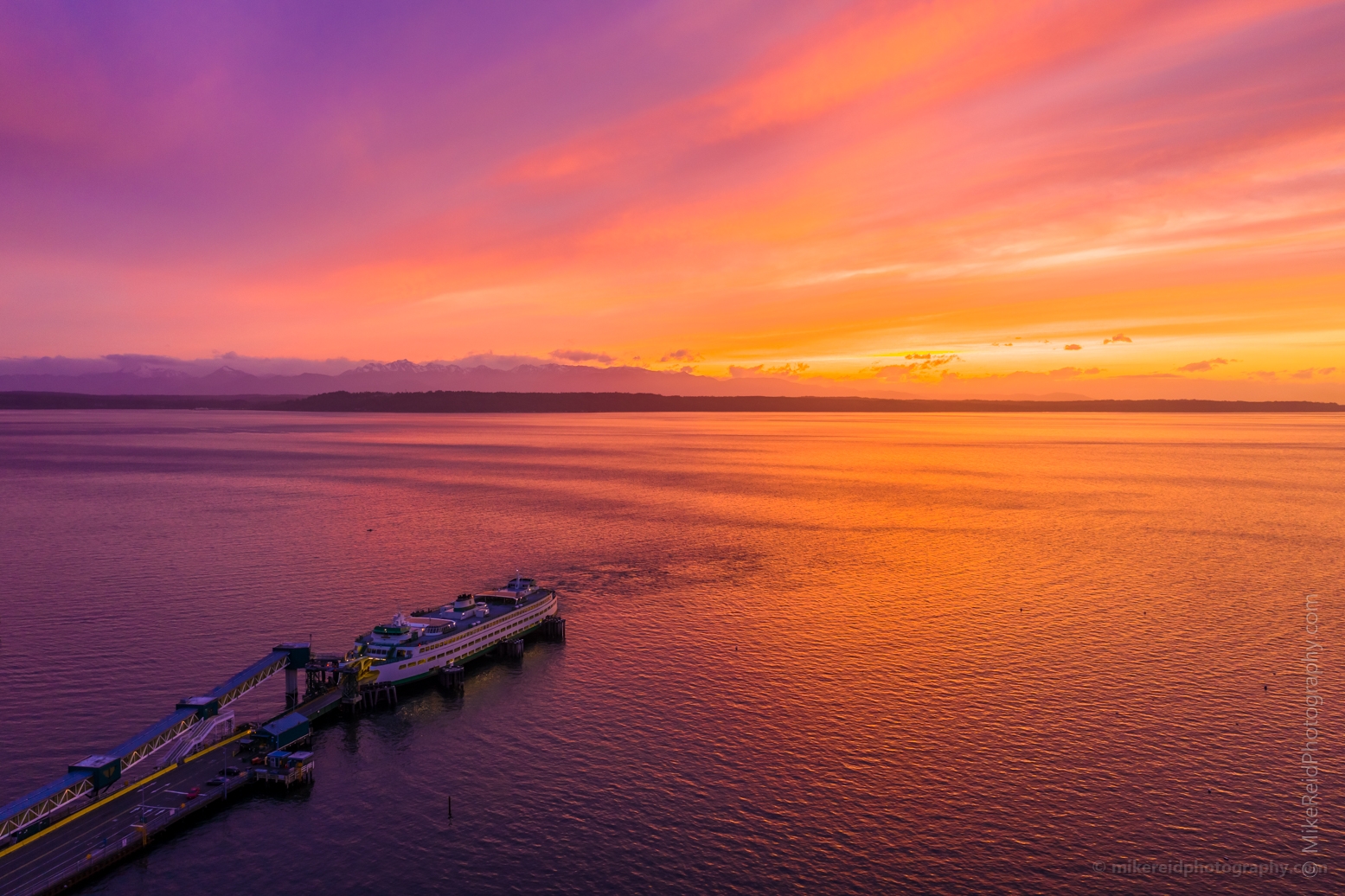 A stunning drone aerial captures the Edmonds Ferry Dock glowing beneath a brilliant Pacific Northwest sunset. The sky ignites with shades of magenta, orange, and violet as the Washington State ferry rests along the calm waters of Puget Sound. This fine art photograph showcases the perfect blend of maritime beauty and evening serenity — ideal for collectors, wall décor, or commercial licensing. Captured by Mike Reid Photography.