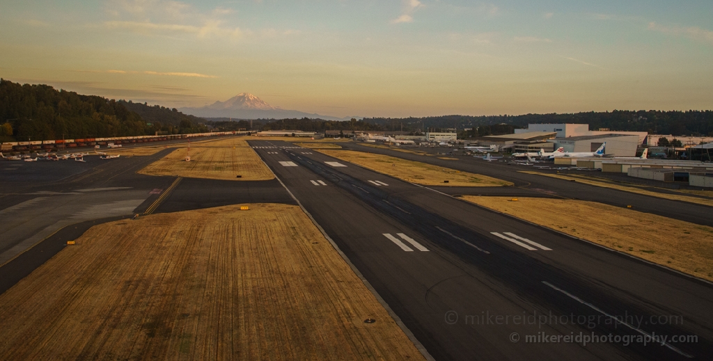 An evening aerial view looking south down the runway of Seattle’s Boeing Field as dusk settles over the city. Mount Rainier rises majestically in the distance, glowing softly in the fading golden light. Captured by Mike Reid Photography, this fine art image blends aviation and landscape—celebrating the balance between Seattle’s industrial legacy and the timeless natural beauty of the Pacific Northwest.